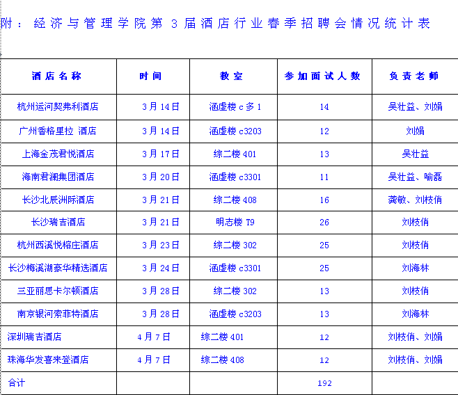 3月7日至3月21日,我院酒店管理教研室组织了面向2014级旅游管理1-4班(含旅游管理方向、酒店管理方向)的春季大型实习生酒店行业招聘选拔会。这也是我系继2015年举行首届酒店行业春季招聘会后的第三届。