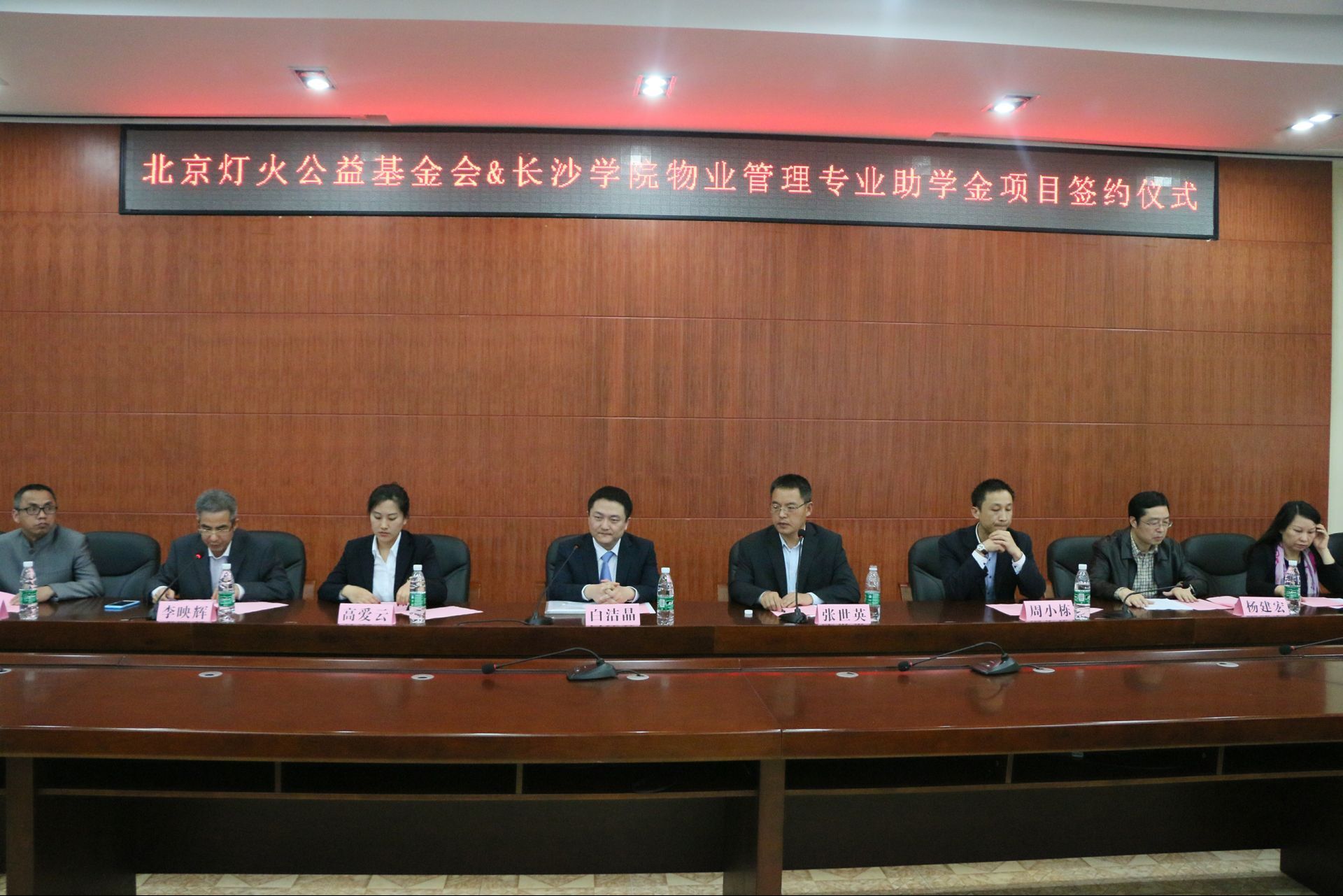 2017年4月7日下午,春意盎然,长沙学院图书馆一楼会议室灯火通明,北京灯火公益基金会&长沙学院物业管理专业助学金项目签约仪式在这里举行。长沙学院副校长张世英教授,北京灯火公益基金会代表、均豪集团人力资源总经理白洁晶,均豪集团湖南分公司总经理周小栋,均豪集团湖南分公司人力资源总监高爱云,长沙学院教务处处长杨建宏教授,经管学院院长李映辉教授,学院总支书记李福英教授,以及物业管理专业部分师生代表出席了本次签约仪式。