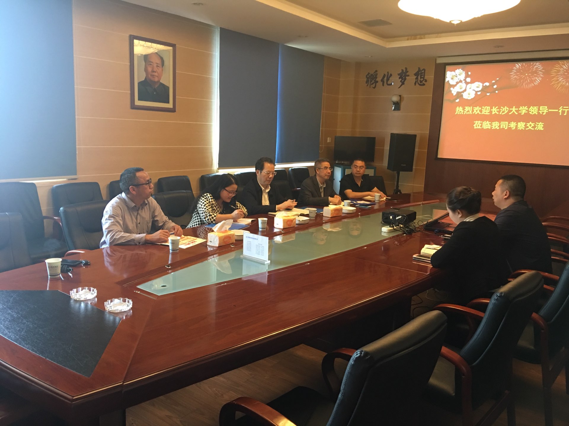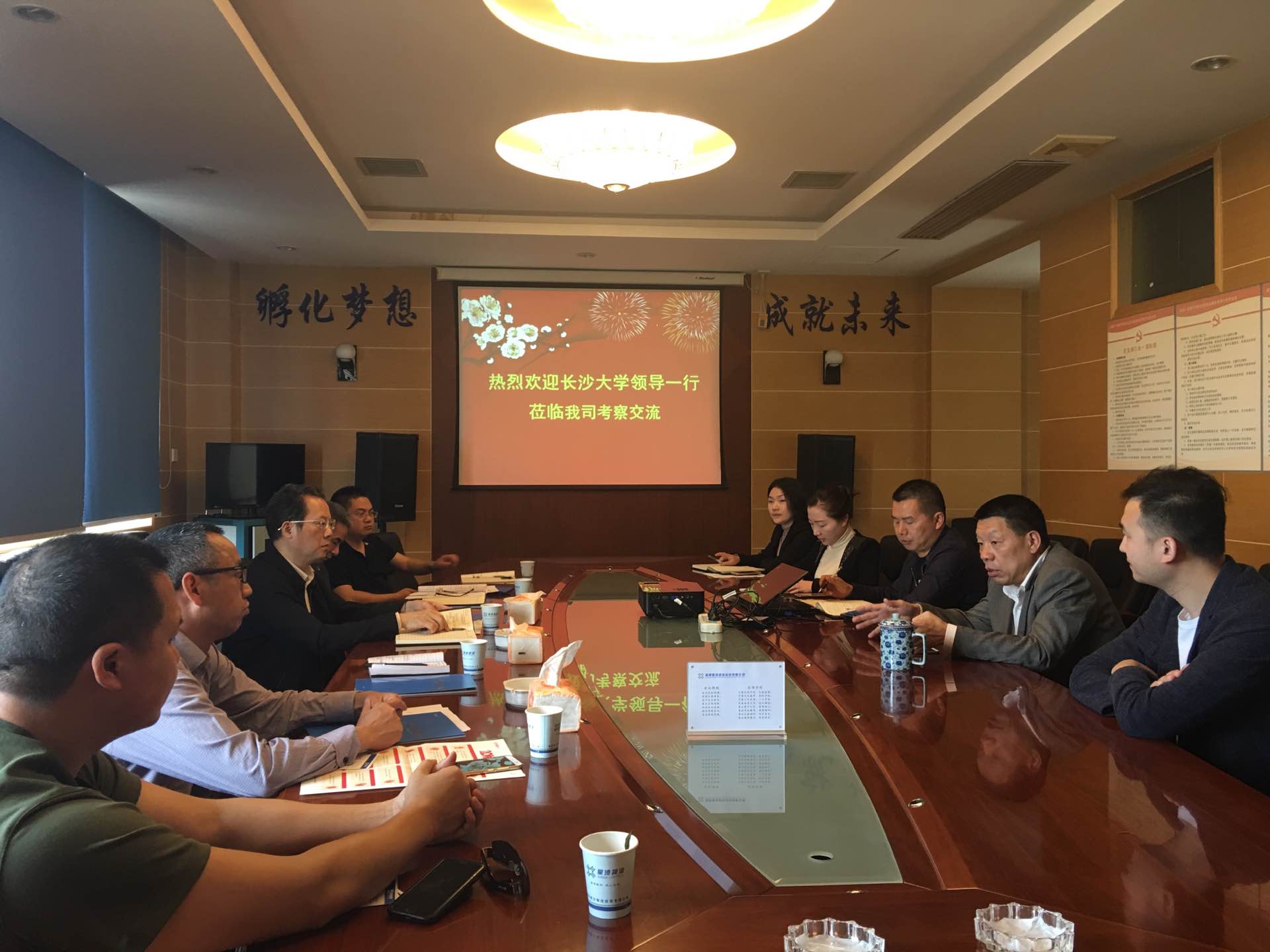 公司董事长兼总经理尹国杰先生及公司副总经理姜向林等热情接待了学校考察团一行。在座谈会上姜副总经理介绍了星沙物流的基本情况、业务范围以及创新创业示范基地,提出了与学校共建见习实习基地、大学生创新创业孵化基地、科技成果转化基地的合作意向。在听取对星沙物流成长历程和合作愿景的介绍后,我校经济与管理学院院长李映辉教授介绍了经济与管理学院的师资队伍、学科专业发展及人才培养等方面的情况,完全同意共建“三个基地”的构想,并阐述了具体的合作模式和实施路径。尹国杰先生非常赞成与学校共同协作培养创新创业应用型人才,他认为从宏观上看创新创业是永恒的主题,对产业发展可产生巨大影响,学校与企业互补资源,合作共赢非常必要。