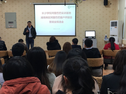 2016年11月22日下午2点30分,由阿里巴巴湖南分公司、长沙跨境人才培养基地、长沙学院跨境电商工作室共同举办的长沙学院跨境电商实训基地阿里企业开放日暨就业双选会在综二楼401室进行。来自湖南老木坊贸易有限公司等10家湖南区域的阿里巴巴客户共23位企业代表参与会议。活动分为工作室介绍、平台分析、第三方交流和人才双选四个环节。