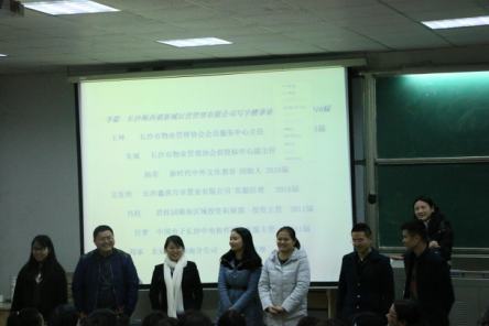 新城运营管理有限公司事业部经理李聪以“物业管理的前世今生”为题对物业管理的过去、现在、未来进行了深刻分析与总结。李总的精彩分享让学生对物业管理的价值与技术含量有了深刻体会,消除了“物业管理就是保安保洁”的片面认识。今年7月份才毕业、现任均豪集团长沙分公司市场经理的刘乖从自己当前工作中的能力欠缺角度切入,分享了做好物业管理领域工作的重点难点以及在校学习的重要性,刘乖学姐在工作岗位上的努力与付出深深震撼了学生们的心。随后,两位在物业管理行业协会任职的优秀校友王坤和朱斌从协会的宏观视角分享了他们对物业管理的理解和在协会工作的感悟。