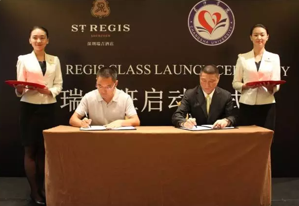 珠海华发喜来登酒店及珠海瑞吉酒店“瑞吉班”启动仪式别开生面。珠海华发喜来登酒店马来西亚籍董事总经理邢富莱先生,人力资源部总监韦漫雪女士及房务、餐饮等其他部门总监以及对接实习生部门的中层管理人员出席了此次启动仪式(因珠海瑞吉酒店仍在筹建中,我校第一批“瑞吉班”学生将对接珠海华发喜来登酒店实习和珠海瑞吉酒店两家酒店)。邢富涞先生首先用漂亮的英文致辞,表达了酒店致力于将“瑞吉班”学生培养为“酒店职业经理人”的愿景;张世英副院长对酒店方对我校入选“瑞吉班”学生培养的良苦用心表达了衷心的感谢,对双方今后校企合作模式进行了展望,提议通过“鼓励青年教师到酒店挂职锻炼、聘请酒店高管到学校讲学、担任兼职教授、在课堂植入喜达屋酒店管理相关理念及课程”等多种渠道深化校企合作,并殷切希望双方能够共同致力于将“瑞吉班”所对应的三家酒店建设成为湖南省普通高等学校实习示范基地。随后,张世英副院长与邢富涞董事总经理分别代表学校与酒店签订了“瑞吉班”校企合作协议,并共同为“瑞吉班”揭牌。