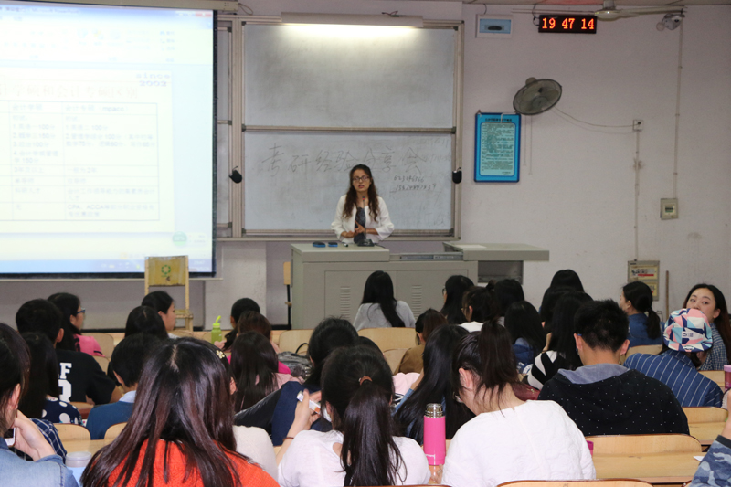 交流会中,12级的四位同学在简单的自我介绍后开始了自己的分享。孙瑞梓同学今年考取了湖南师范大学研究生,她以自己所考课程开始自己的经验分享,从英语和专业课两方面进行分析,并跟在座的同学介绍了专硕考试和学硕的区别。今年考取重庆理工大学研究生的康艳同学认为,考研的成功等于正确的方法加不懈的努力以及恰当的复习材料利用。在英语方面,康燕认为要重视记单词而不是只通过阅读来记忆,数学方面要多多整理、真正理解规律定理而不是一味地做题,对于报培训班的问题,她认为在现在网络发达的社会可以通过自己搜索网上视频来学习。喻快和刘萱萱同学选择了出国,分别考取了澳洲昆士兰大学和英国诺丁汉大学的研究生。他们简单分析了出国准备的一些注意事项,同时给予了大家找准自身出国定位以及托福雅思考试方面的建议。北京师范大学研究生毕业的张彩老师为大家作了专硕考研经验指导,她从会计学硕与专硕的区别着手介绍了考研的一些方向、制度以及社会认可度等,让同学们受益匪浅。