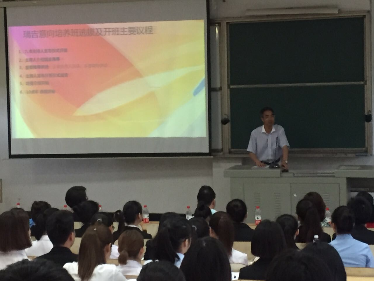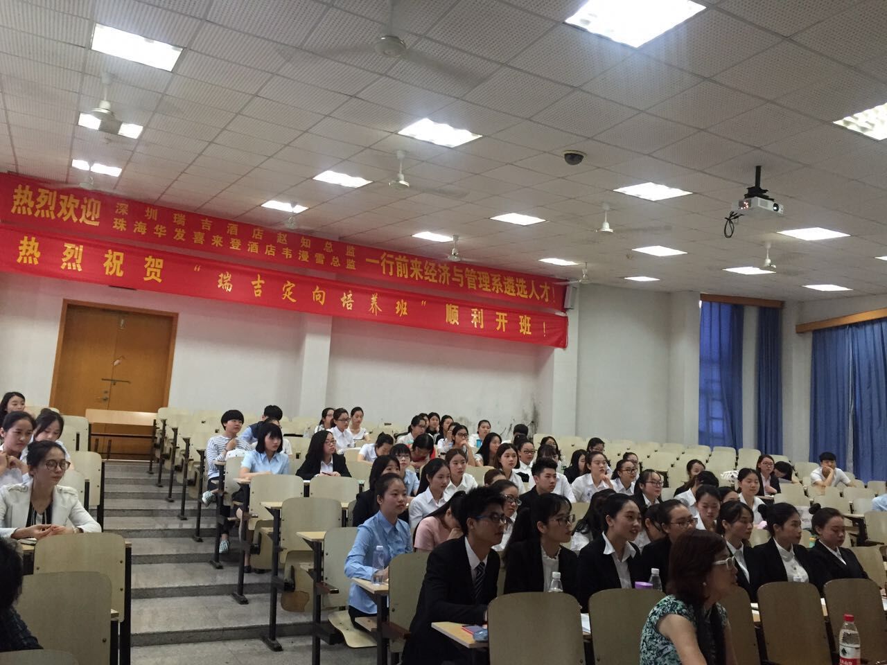 6月9日上午9点,一场别开生面的“瑞吉˙喜来登”意向培养班宣讲暨选拔会在涵虚楼B多4教室隆重举办。此次宣讲会标志着我校经济与管理系与喜达屋酒店与度假村集团中国区旗下深圳瑞吉酒店、珠海华发喜来登酒店、珠海瑞吉酒店三家酒店历时超过半年的前期接洽、充分沟通和精心筹办而联合启动的“瑞吉˙喜来登”意向培养班正式拉开了帷幕。