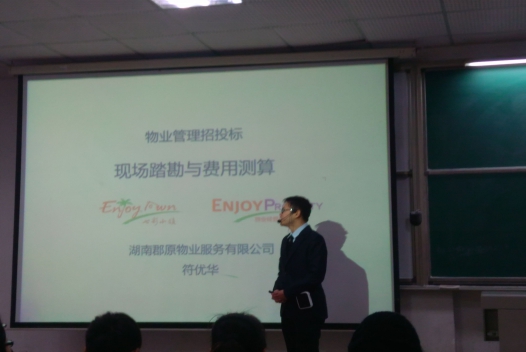 2015年12月14日,湖南郡原物业服务有限公司市场部经理符优华先生以《物业管理招投标的现场踏勘和费用测算》为题,给我系2013级物业管理专业的学生进行了生动而细致的专题讲解。
