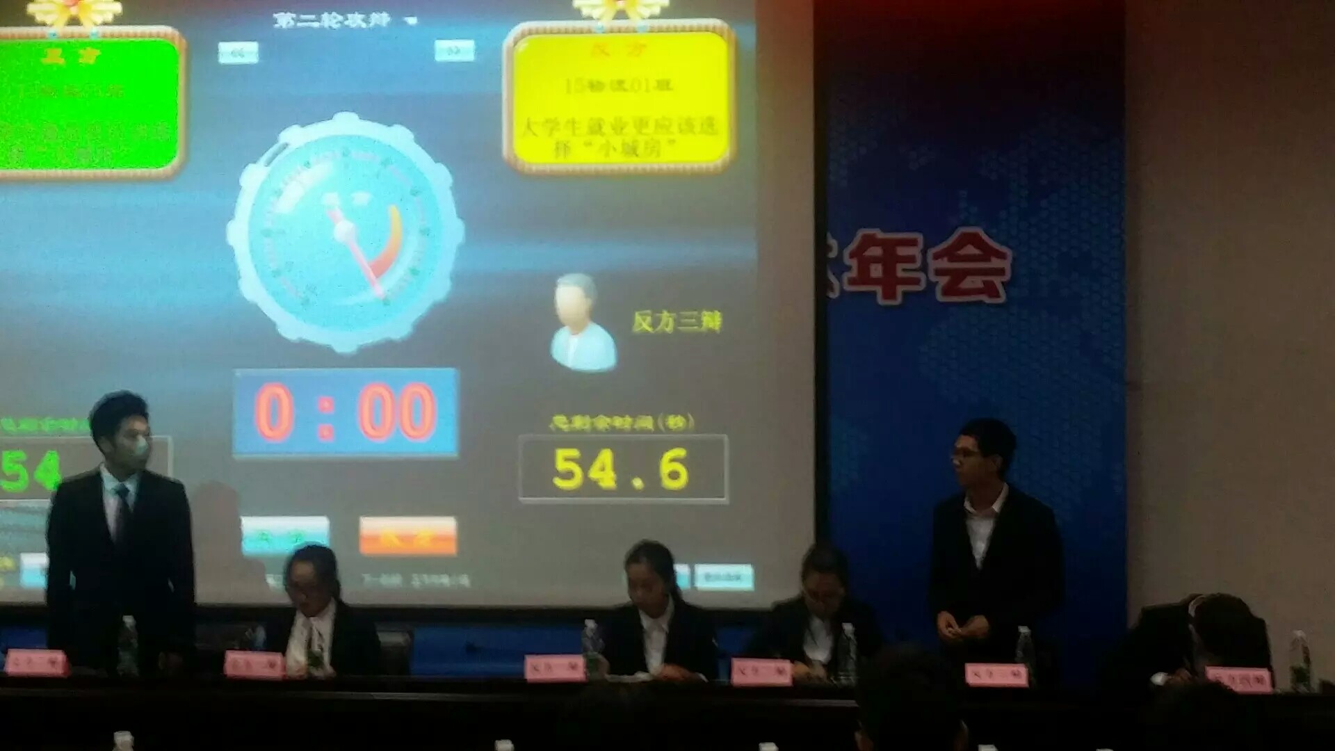 第一场比赛是由正方15级物业一班所代表的“大学生就业更应选择‘大城床’”和反方15级物流一班“大学生就业更应选择‘小城房’”这一辩题来争夺季军。正反双方充分发挥自己的智慧和团结协作能力,就各自观点展开了激烈的辩论,旁征博引,赢得了台下观众的阵阵掌声。一番语言的激战后,15级物流一班摘得季军。来自物流一班的刘畅、物业1班黄奔凭借他们出色的反应能力和谨慎的逻辑力获得本场比赛的最佳辩手称号。