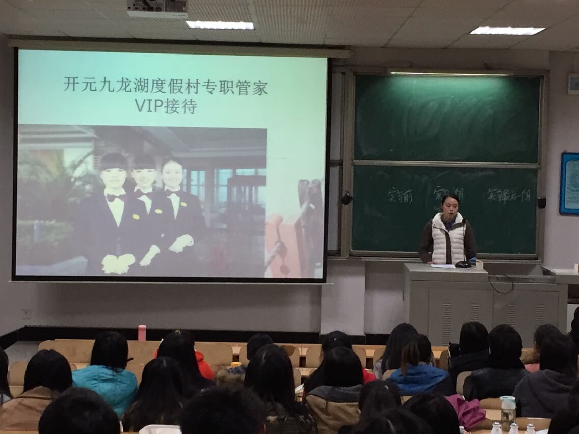 为提升学生毕业实习质量、进一步推进实习工作开展、促进同专业不同年级间的交流,我系一直延续着在毕业生毕业实习结束后组织开展优秀实习生进行经验交流与分享的传统。本次会议经集中实习酒店负责人及实习老师推荐,特别选取了6位有代表性的同学:在宁波九龙湖度假村从事贵宾贴身管家工作的郑晗同学;在华天大酒店担任餐饮部秘书和人力资源部工作的李玉霞同学;在海南七仙岭君澜酒店经过了餐饮、客房、营销、康体四个部门历练的牟京华同学;在舟山威斯汀酒店人力资源部担任人力协调员的刘超同学、在上海复旦皇冠酒店前厅部担任礼宾工作的刘祖睿、在杭州九里云松酒店餐饮部和营销部门实习的周胜君同学。出席本次会议的有龚敏、刘海林、刘娟、廖化化等老师及12级、13级旅游管理和酒店管理专业同学,会议由吴壮益老师主持。