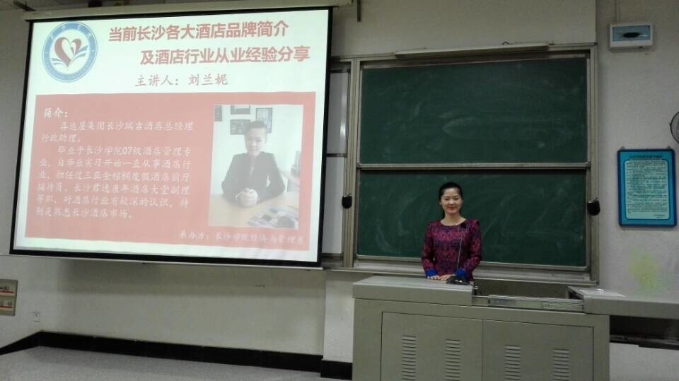 11月25日晚七点,我校涵虚楼C多4教室热闹非常,不时传来由衷的赞叹和会心的笑声,这是经济与管理系邀请我校旅游管理专业2012届毕业生、现任长沙瑞吉酒店总经理助理刘兰妮讲座的现场。我系王永启副书记及龚敏、刘娟、吴壮益、廖化化、刘海林、喻磊等老师均参与交流,听取讲座的同学们以酒店管理方向在校生为主。