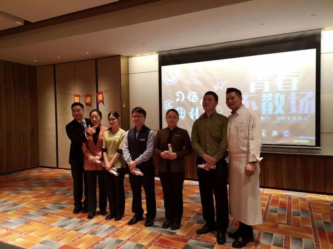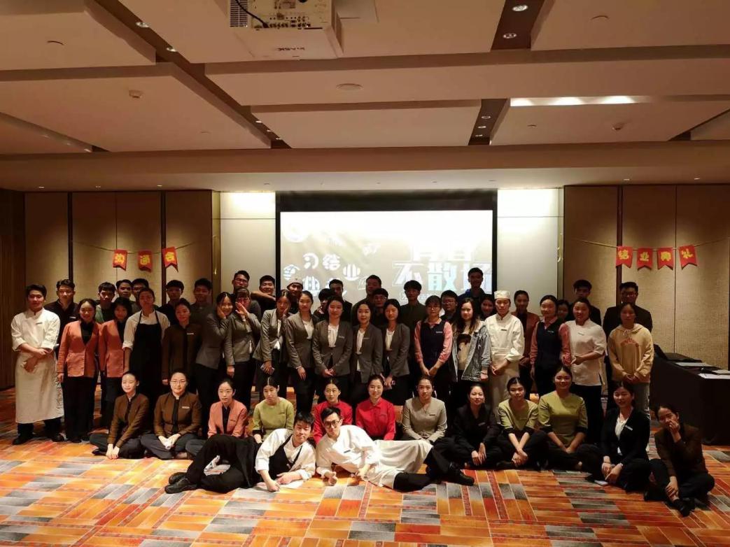 (实习结业典礼现场我院2015级实习生们与酒店负责人合影留念)