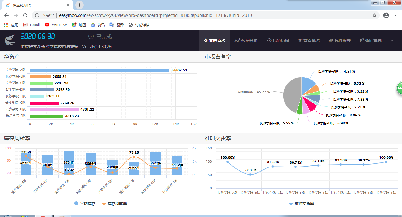 本次大赛分两个阶段进行:学校于2019年12月26日到2020年3月20日期间组织筹办了“易木杯”长沙学院第一届全国供应链大赛赛前报名、线上赛前培训及线上选拔的工作,共吸引了10支队伍,合计40名学生参加。经过的磨练,经过四期校内抗赛练习赛角逐、层层选拔,最终有“一往无前”等8支队伍获得校内决赛参赛资格。3月21日下午正式举行学校决赛暨国赛选拔赛。8支队伍在耗时长达4小时的两场校内选拔赛中激烈角逐,最终由18、19级物流管理专业学生王嘉、龚芊、黄颖、胡汉林组成的“一往无前”队以及李竞成、张路、潘碧轩、王旺庭组成的“风之采队”在此次大赛中脱颖而出,将代表我校出征第一届全国供应链大赛的全国赛。