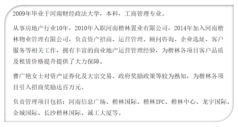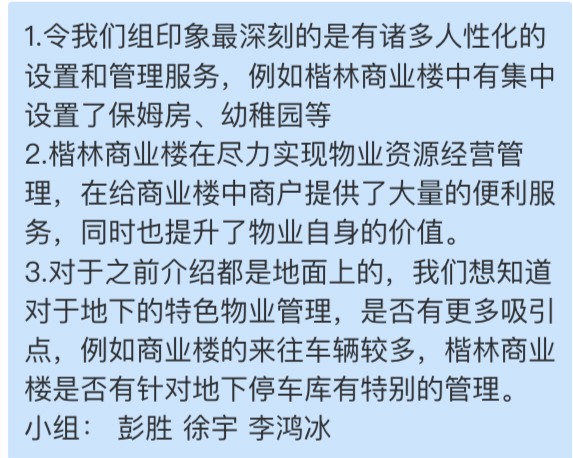 其次,曹广艳总监向同学们介绍了楷林物业公司,楷林物业从2019年专注高端写字楼细分领域,从写字楼开发到写字楼开发、物管、运营三驾齐驱,从郑州到长沙,再到上海、北京、天津、苏州、杭州、武汉、西安等一线及新一线城市,开发面积达到220万平方米,物业管理及运营面积超过2000万平方米,服务金融机构总资产超3万亿元。公司坚持以“让商务生活更美好”为愿景,以“写字楼物业”为核心,实施“基础物业、资产管理、咨询服务、智能生态圈”四轮驱动式平台发展。