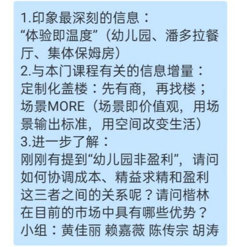 黄蕾老师根据企业讲师内容组织学生分组讨论,同学们分组梳理自己的思考并且在聊天区域进行教学反馈,20个小组先后在线提交学习心得,大家能够相互看到彼此关注的信息点,激发群体思考,群智涌现。