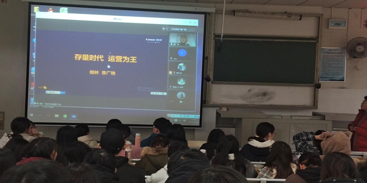 2020年12月4日星期五下午2点,涵虚楼B多3教室内《物业经营管理》课程正在进行网络连线教学,任课老师黄蕾副教授邀请楷林物业管理有限公司资产运营总监曹广艳女士,在线为2018级物业管理专业的同学做题为《存量时代、运营为王》的线上主题分享。