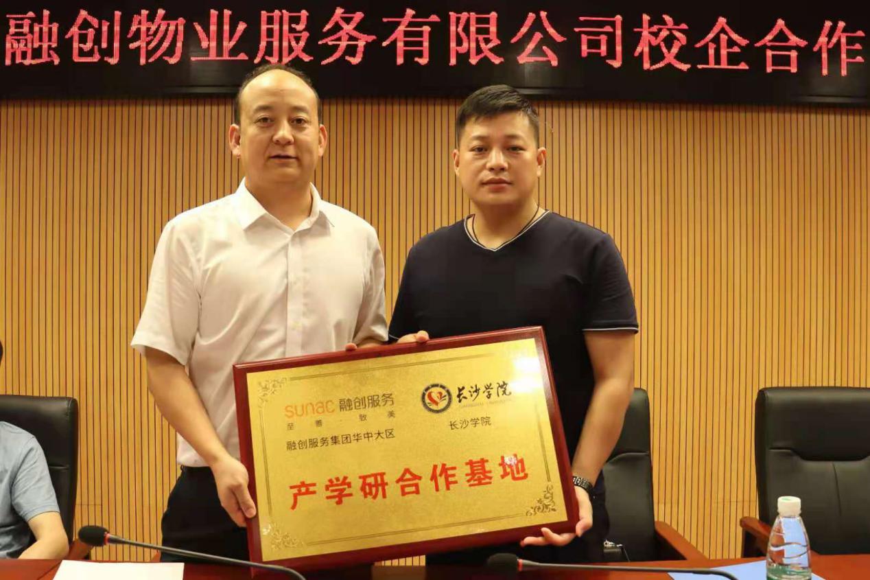 副校长曾广胜和总监马莉洁分别代表长沙学院和湖南融创物业服务有限公司签署校企战略合作协议。高级经理李振兴与副校长曾广胜共同为产学研合作基地揭牌。