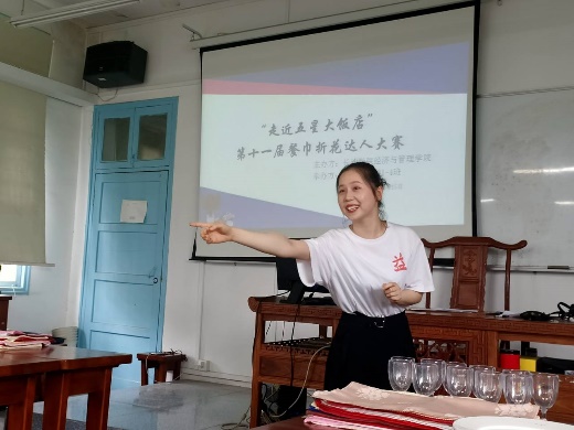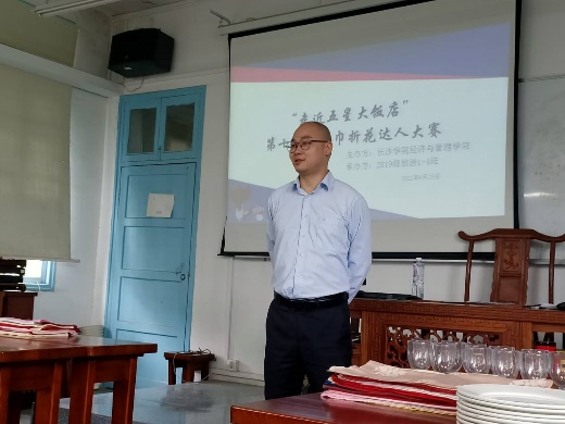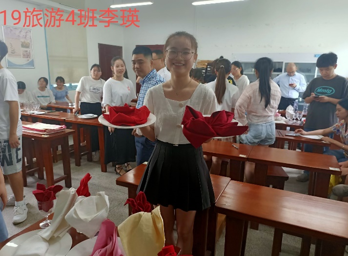 6月25日中午12:30,由经济与管理学院主办、19级旅游管理1-4班承办的第十一届餐巾折花大赛在第二综合楼404隆重举行。餐巾折花是酒店餐饮服务六大技能之一,是旅游管理学生专业素质的重要组成部分。本次比赛由承担本课程教学任务吴壮益老师还特别邀请了长沙北辰洲际酒店兰调全日餐厅经理申雷、酒吧经理胡碧、培训经理刘青青共同担任了本次大赛的评委,我院副院长熊礼明博士、基础教研室主任汤进华博士全程观战并颁奖。