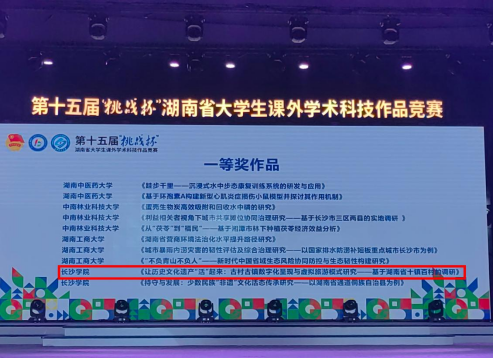 5月22日,由共青团湖南省委、省教育厅、省人力资源和社会保障厅、省科学技术协会共同主办的第十五届“挑战杯”湖南省大学生课外学术科技作品竞赛决赛在长沙理工大学落下帷幕。由我院裴习君、黄敬茹老师指导,学生苏慧琦、李园杰、向文彬、唐彩云、罗文涛、倪湘楠、郭奕航共同完成的作品《让历史文化遗产“活”起来:古村古镇数字化呈现与虚拟旅游模式研究——基于湖南省十镇百村的调研》 经过不断打磨、层层选拔,从635件作品中脱颖而出,获得本届“挑战杯”赛事一等奖,该作品将代表学校参加今年下半年在贵州大学举办的第十八届“挑战杯”全国大学生课外学术科技作品竞赛。
