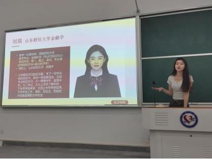 第二个发言的是考上了山东财经大学金融科技专业刘琪学姐。刘琪学姐是个佛系中带着狠劲的女生,她谦虚地说,她的大学生活是在平平淡淡中度过,考了一些专业相关的证书,参加一些竞赛活动,完成了专业知识学习,大一懵懂半年,疫情半年,大二考证,大三上半年了解科研,下半年开始考研,大四上半年考研结束,下半年找工作、调剂、写论文。关于考研刘琪学姐说,考研最重要的是早做准备,选定好目标院校,有条不紊地安排时间备考,过程会很枯燥,保持良好的心态,坚持下去,必定守得云开见月明。前期可以参考别人的备考状态,后期可以自行调整找到最适合自己的学习方法和时间安排。在考研过程中,要注意有效地利用时间,尤其是在紧张的备考期间。她建议考生可以通过分段式学习,每天固定学习时间,逐步增加学习强度,保证复习效率。此外,她还提醒考生要多参加模拟考试,通过模拟考试的结果找出自己的不足之处,针对性地进行复习和提高。最后,她认为考研过程中也需要适当地放松,保持良好的心态和身体状态。