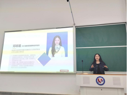 第四位发言的是考上了康奈尔大学会计学硕士的邓詠瑜学姐。邓詠瑜学姐在校期间成绩优异,专业成绩排名前10%,曾获得多次奖学金。作为项目负责人获校级科研育人项目1项,以第一作者参与发表期刊论文2篇,通过计算机二级、英语四六级考试,雅思7分。获得互联网+创新创业大赛湖南省省赛金奖及国赛铜奖,并成功入选博鳌亚洲论坛经济与安全大会志愿者团队。谈到出国留学申请邓詠瑜学姐说,由于需要申请国外硕士看重本科期间的学习成绩,为了申请国外大学她从大一刚开始就必须要保持成绩不低于百分之九十。坚持是她的武器,她自己制定了一个计划来学习英语,如每日的学习计划和无痛学习英语法,如听英文歌、看英语电影和英文小说等,同时她还告诉我们,要适当取舍,我们应该把时间花在你认为最有价值的地方,迷茫时期也不要完全松懈。最后,一个好的学习环境,也是成功的一个重要因素,希望同学们能够多去图书馆和自习室,找到一个安静的环境,开启自己的学习之旅。