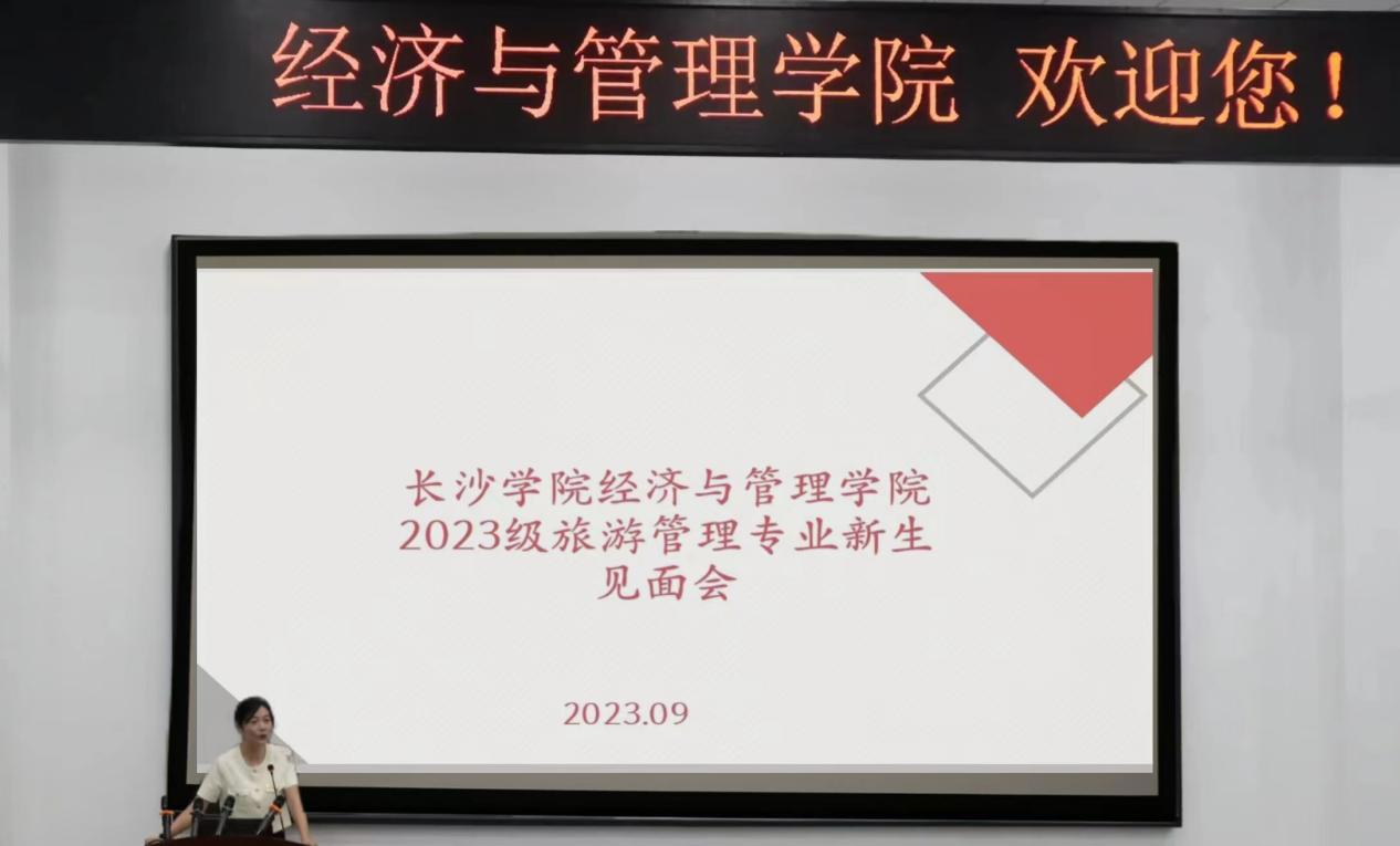 2023年9月13日下午14:00,经济与管理学院旅游管理专业在新经管实训大楼B405举办了2023级新生专业认知教育大会。新生是旅游管理系新的活力和动力之源,为了让新生对专业有一个全面和深入的了解,并指导学生未来四年更好地学习和生活,全系老师在党总支书记詹琳博士的指导下,群策群力,对本次会议的流程、形式、宣讲内容、视频素材等做了多轮讨论和设计,最终确定了本轮方案。大会由旅游管理系主任邓吉祥博士主持,参加此次会议的有学院党总支书记詹琳博士、新生班主任龚敏博士、廖化化博士及旅游管理系部分老师、23级新生和学生导师。