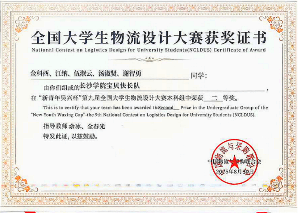 近年来,我院物流管理国家一流专业建设点持续推进教育、科技、人才“三位一体”协同发展,积极通过“以赛促学”激发学生的自主学习能力与创新精神,学生在多项国家级赛事中屡获佳绩。今后,学院将继续落实立德树人根本任务,持续创新人才培养机制,为服务湖南“三高四新”战略贡献长大力量。