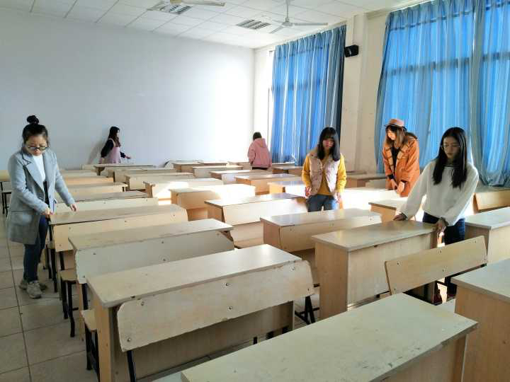 学生党员和积极分子整理教学楼桌椅