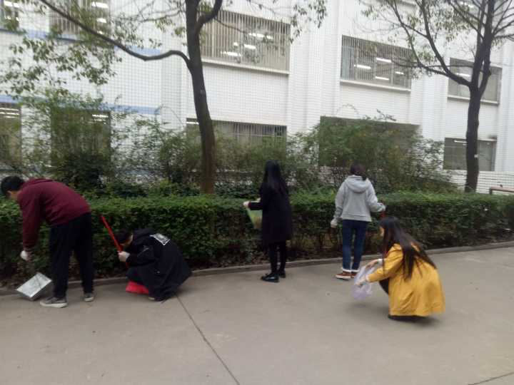 学生党员和积极分子打扫室外卫生