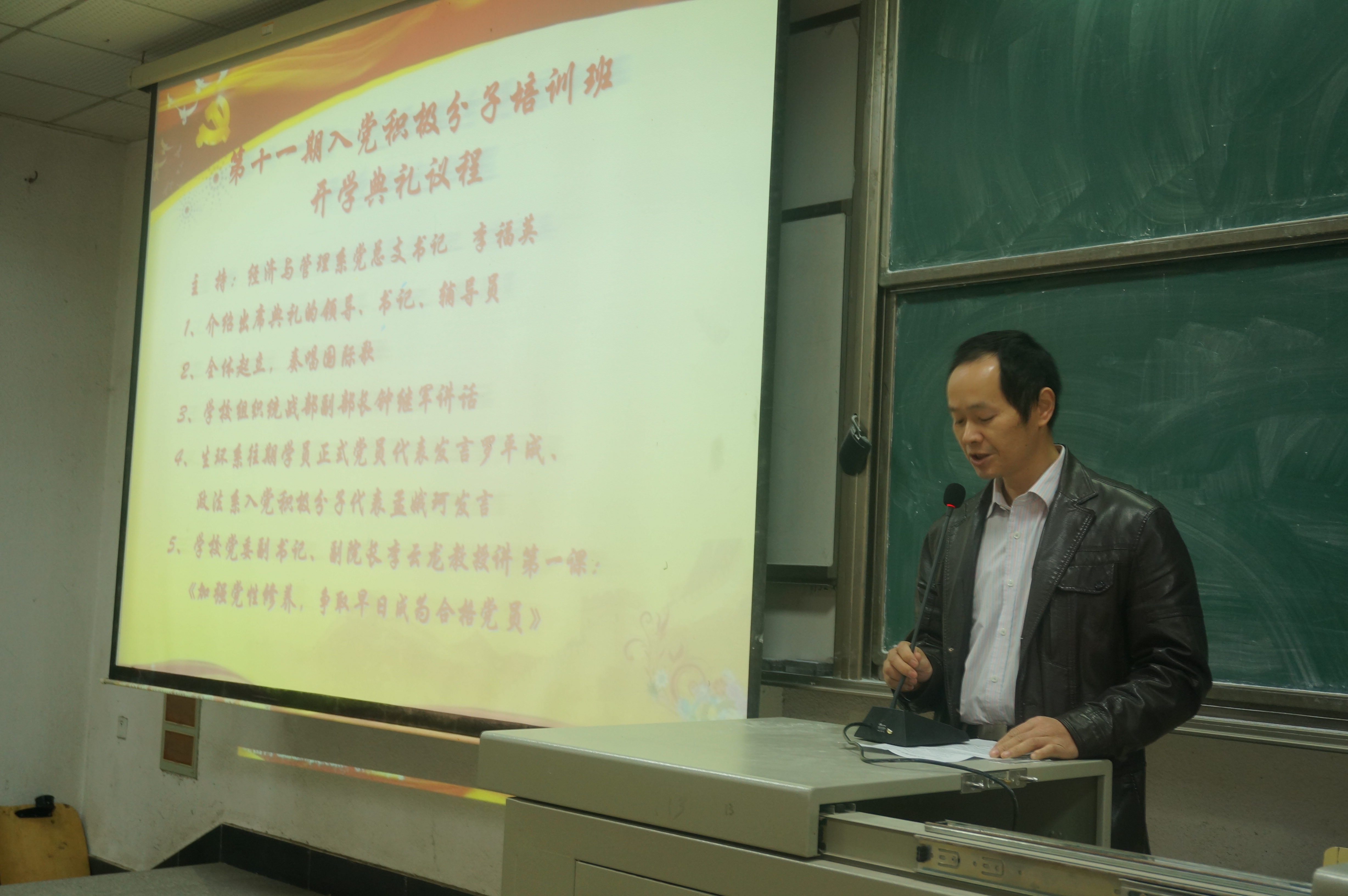 11月15日上午8点,由经济与管理系、政法系、生物与环境工程系3系联合举办的入党积极分子培训班 开学典礼在涵虚楼A多1举行。出席本次开学典礼的有学校党委副书记李云龙,学校党委组织统战部副部长钟继军,生环系党总支书记赵晨曦、副书记吴帧婧,政法系党总支书记谷建春和经管系党总支副书记王永启,会议由经管系党总支书记李福英主持。