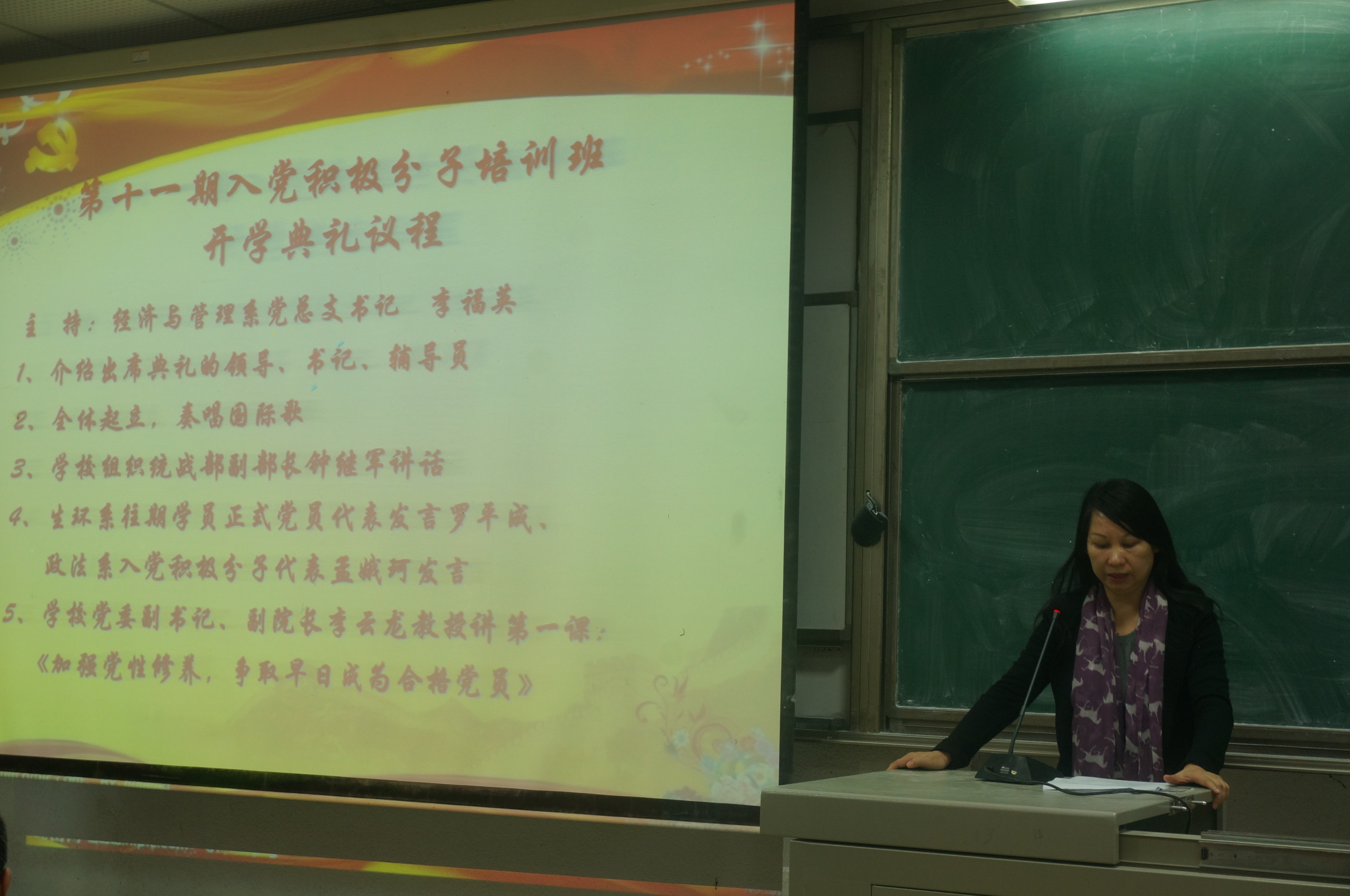 典礼第一项是全体起立,齐唱《国际歌》。在庄严的《国际歌》声中,开学典礼在李福英书记的主持下拉开序幕。她首先热烈欢迎出席本次开学典礼的学校领导系部领导和全体辅导员老师,并祝贺参加本次开学典礼的入党积极分子。接着是钟继军副部长讲话,他主要阐述了党校培训在党员发展、加强党建中的地位与作用,并对入党积极分子的上课纪律做出了相应的要求。