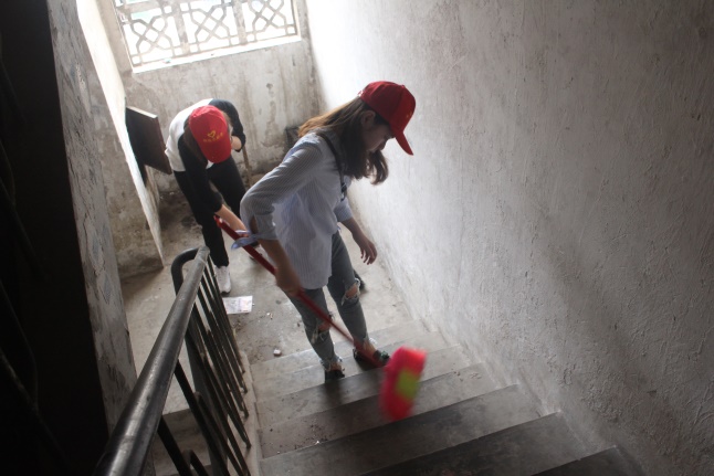 在去社区的路上支部党员们为老人让座、护送老人过马路、随手捡起路上的垃圾……满满的正能量在街道上传播。大家到达地点后,在支部书记的带领下,积极有序的展开了志愿者活动。活动内容分为两部分,第一部分是慰问孤寡老人,帮老人打扫房间卫生,陪老人聊天;第二部分是清理社区楼道的垃圾,社区阿姨带来了工具,带领第二小组去需要打扫的楼道。楼层虽然很高,打扫起来也很辛苦,但大家的积极性却丝毫不减退,脸上无时无刻不洋溢着欢乐的笑容。老人的幸福与激动也展现在脸上,热情的老人还拿出了小零食来招待支部志愿者,临走时老人说到:“真的谢谢你们,我很久没这么开心过了。”