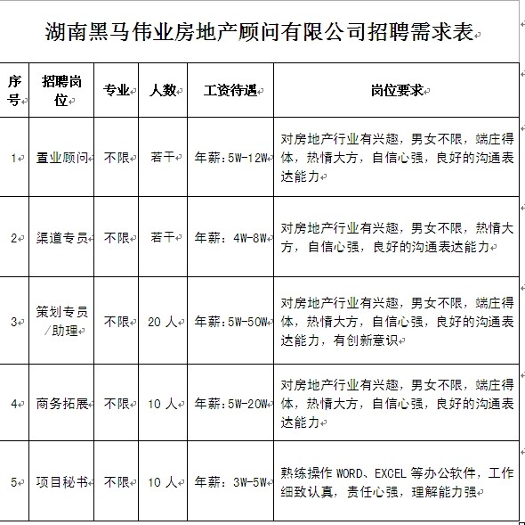 湖南黑马伟业房地产顾问有限公司招聘需求表