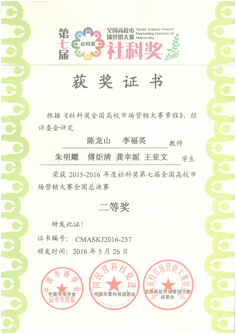 我校ATP团队(傅炬清、朱明耀、王亚文、龚幸妮)历经八个月的努力,在本届大赛中获全国复赛一等奖,决赛二等奖,最佳创意团队奖等。比赛自去年十月启动以来,历时八个月,ATP团队参与的全程赛需要完成好营销策划案和实战销售成绩。最终,在经管系党总支书记李福英和陈龙山老师的指导、队长傅炬清的带领下,ATP在复赛中脱颖而出,获得一等奖,成功晋级总决赛。