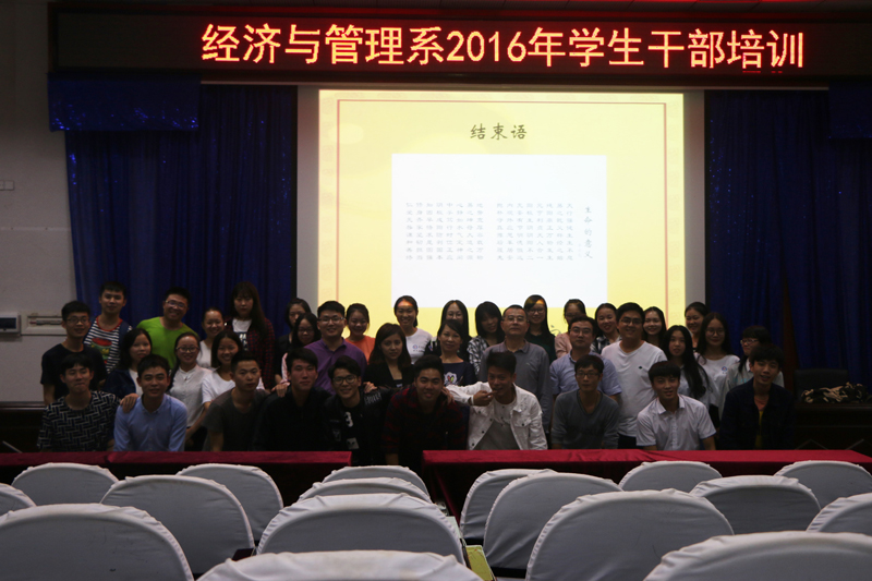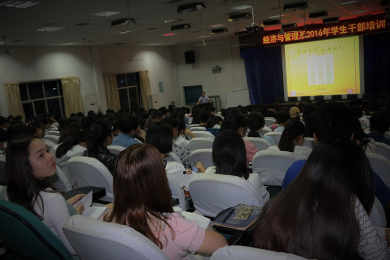2016年10月9日晚7点经济与管理系在致远楼学术报告厅组织召开了以“参悟立道,立德树人”为主题的第一场学生干部培训讲座。本次培训由经管系团支部王永启副书记主持,主讲人为长沙学院原党委副书记李云龙教授,李福英书记、辅导员向伟老师、喻磊老师、张文茜老师、第三届学生会部长们及其预备干事、16级各班班长、团支书参加了本次会议。