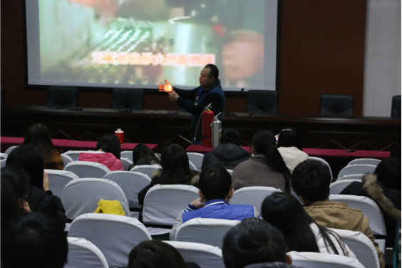 林教官首先通过一个火灾案例,引出了火灾的危害性以及防范火灾的重要性。他对目前我国普遍的火灾起因进行了分析,并重点介绍了寝室使用大功率电器存在的安全隐患,普及了用电安全以及灭火器的种类、操作使用方法等一系列消防安全知识,让全体与会教师充分认识到“隐患险于明火,防范胜于救灾,责任重于泰山”。进而,林教官阐述了怎样有针对性地去应对已经发生了的火灾,必须要掌握扑救初期火灾、组织引导人员疏散逃生等方面的能力,同时他也特意教了大家一些逃生方法、自我保护措施以及灭火器的使用方法,在讲述当中,林教官不仅提及了一些逃生的实例,也现场演示了如何使用防毒面具与灭火器,并邀请在座学生上台使用消防器具,亲手指导,让同学们近距离了解如何使用防火器具,将理论知识用于实践。并以成功的案例证实各类防火器具在火灾逃生过程中的重要作用。