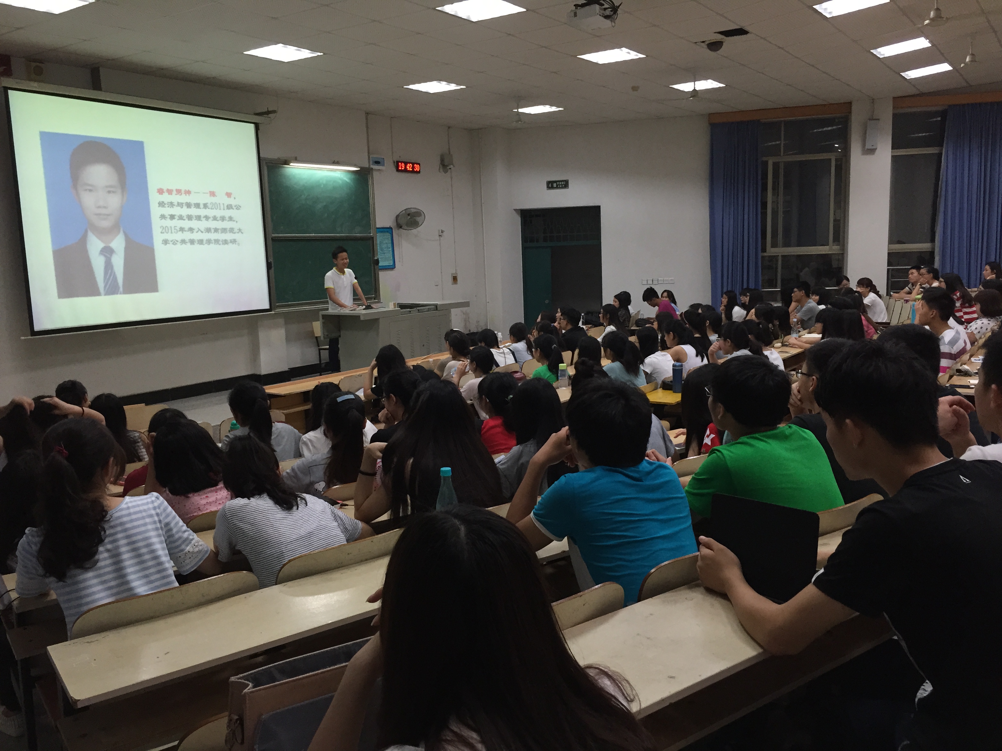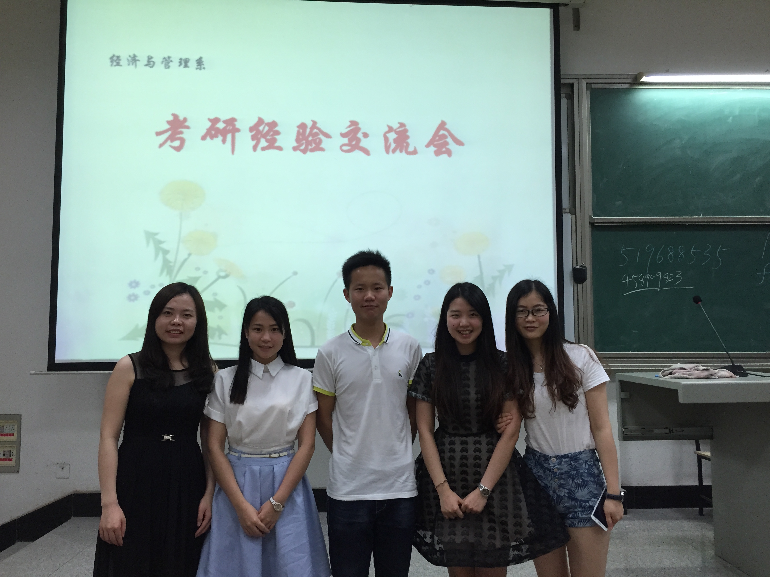 为了进一步提高我系学生的考研热情,明确考研目标,掌握相关考研技巧,了解更多考研信息,2015年5月28日晚7:00,经管系考研经验交流会在涵虚楼C多4教室举行。本次交流会力邀往届与应届考研中成绩优异、经验丰富的彭子宁、范立辉、陈智、皮征仪、肖迪出席,交流会由辅导员李素娟老师主持。