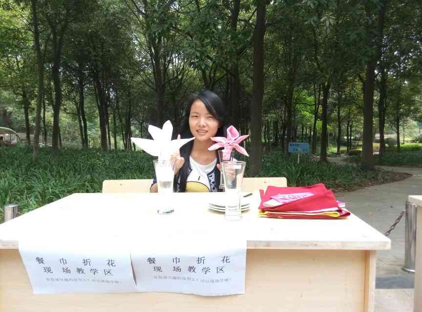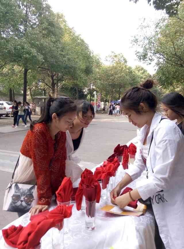 本站活动包括精美餐花艺术品展示、餐巾折花技术现场教学和现场讲解三个部分。所有作品均在担任《餐饮管理基础》课程教师的指导下,由在日前举办的“餐巾折花达人”大赛中获奖的优秀选手精心制作完成。所展出的作品分为杯花、盘花三大类,造型涵盖植物类、动物类和实物类,数量超过150种,且均技法到位、折痕清晰、定型精准、造型精美。其中最具代表性的迎宾天鹅、孔雀开屏、玫瑰、彩蝶纷飞、蜂鸟等作品形象生动,几可以假乱真,引得现场观众赞叹不已,不少同学纷纷掏出手机拍照留念。