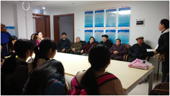 8点20分,学生会成员带上自己为老人们准备的礼物来到湘橡社区,负责人与老人们也对同学们的到来表示欢迎。活动伊始,负责人首先向成员们介绍了老人的基本情况,其中有一位95岁的高龄老爷爷,令同学们惊讶不已。青志协部长龚幸妮也代表学生会成员向老人致以最真诚的问候并让学生会成员作了简单的自我介绍,随后,青志协部长与文娱部部长为老人合唱了一首“为了谁”。在同学们的热烈欢迎下,社区的刘奶奶也演唱了一首歌曲。最后,大家一起合唱了歌曲“映山红”,整个活动现场充满了欢声笑语。