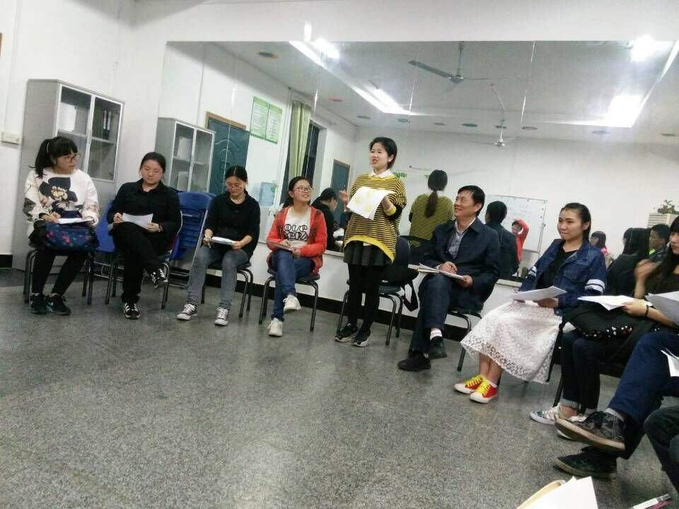 第一次活动是在“相见甚欢”的环节中开始的,成员就“采访信息卡”上的各个问题找到与信息相符的成员。大家踊跃参与,积极互动,很快降低了来自不同年级学员间的陌生感。接下来,每一位成员开始勾勒自己的“生涯花瓣”,即对五个问题进行思考:“我是谁”、“假如……,我将会感到非常满足”、“我希望别人说我是一个什么样的人”、“我加入这个团体的期望”、“我希望这个团体是怎样的”。之后,每个成员围坐着开始一一分享,有人说:“假如我考上了韩语高级证我将会非常满足。”也有人说:“假如父母能够一直健健康康的我会非常满足”。有人希望别人说她是善良、充满正能量的阳光女孩,有人则希望别人认为他是智慧、乐观的大男孩。我们都开始明白每个人有不同的人生五彩梦。每一位学员给自己取了一个积极向上的工作名,每一个人都是团队中的一名宝贝。为了增强团队的凝聚力,本期训练营的营长也顺利产生,是由毛遂自荐的一名大一女生担任。