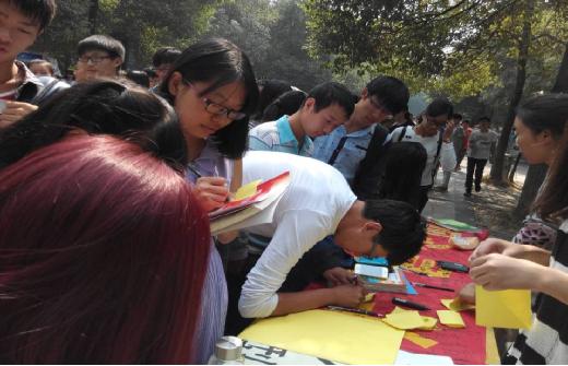 “关注心理健康,促进社会和谐”是第二十三个“世界精神卫生日”的主题, 我系积极响应校心理中心以及校心理部号召,在10月10日这天以“煲一碗自己的‘心灵鸡汤’”为主题,在维智大道进行摆点宣传,吸引了广大同学前来参加。