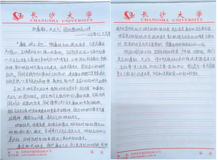 学院团员青年纷纷表示,将从身边小事做起,做好点滴的积累,不断增强纪律意识、廉洁意识,用实际行动传承廉洁文化,弘扬清风正气。“作为一名学委和学生会干部,我的工作和’廉洁’一词息息相关,我不能因为和某一同学关系好就包庇他或者开后门。”20物流2班学习委员李令说。