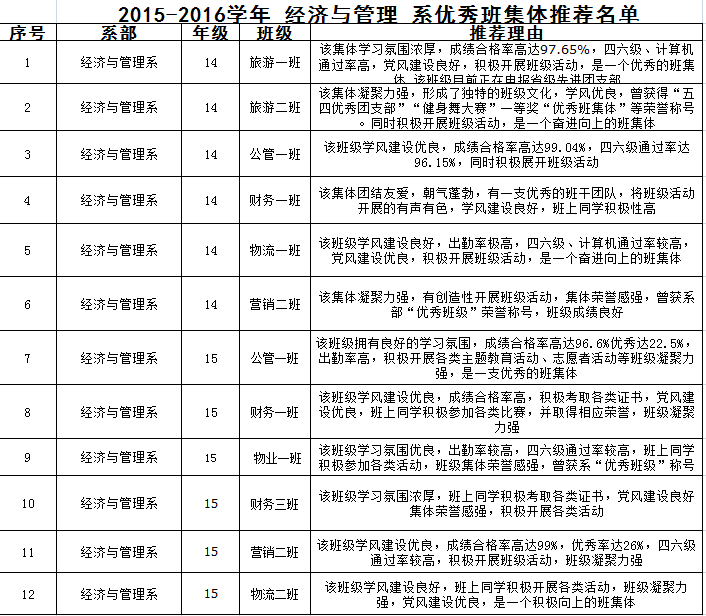 经济与管理系2015-2016学年优秀班级推荐名单公示