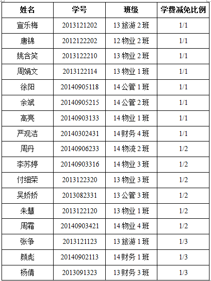 为帮助家庭经济困难的学生顺利完成学业,根据《长沙学院家庭经济困难学生资助管理办法》和《关于开展2014—2015学年学费减免资助工作的通知》的要求,经学生本人书面申请、相关家庭经济情况证明(低保、下岗、残疾、医院病情证明和购药发票等)、班委会评议、系部初步审核,我系拟上报学生处资助中心对宣乐梅等17名学生减免2014—2015学年部分或全部学费。现予以公示,如有异议,请与系学生工作办公室李素娟老师联系。