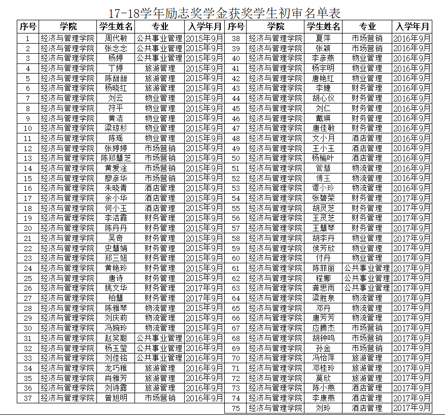 根据学校学生工作处《关于开展2018年国家励志奖学金、国家助学金评审工作的通知》(办通 [2018]25号)的工作要求,严格根据《长沙学院学生奖励办法》(长大发[2017]38号)文件精神,经学生本人申请,学院评定小组研究决定,推荐周代敏等75位同学作为我院2018年度国家励志奖学金评定对象,现对评定结果予以公示。