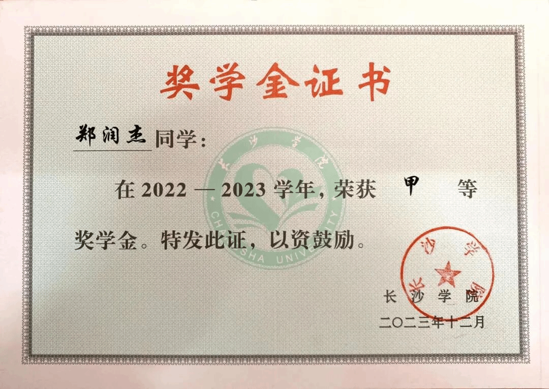 曾获:湖南省第十五届挑战杯课外学术作品省级三等奖、长沙学院甲等奖学金、长沙学院优秀学生、长沙学院优秀共青团员。