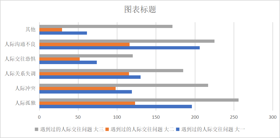 547人人际沟通不良:其中大一206人,大二116人,大三225人;261人遇到其他问题:其中大一61人,大二29人,大三171人。