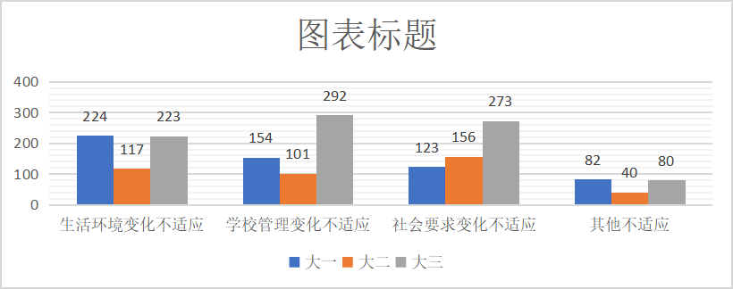 环境适应方面,564人生活环境变化不适应:其中大一224人,大二117人,大三223人;547人学校管理变化不适应:其中大一154人,大二101人,大三292人;552人社会要求变化不适应:其中大一123人,大二156人,大三273人;202人有其他不适应:其中大一82人,大二40人,大三80人。