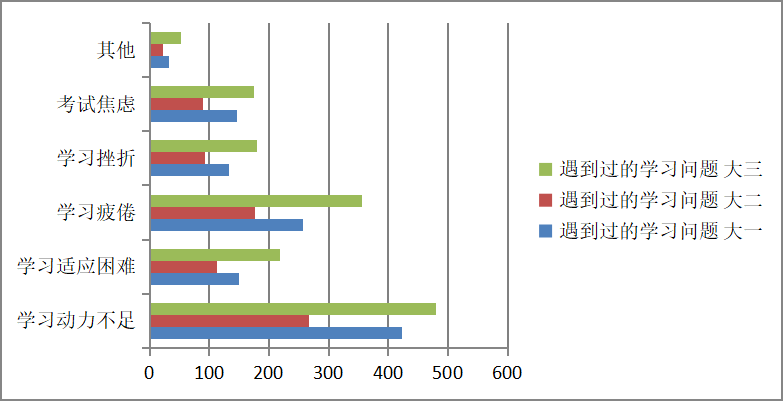 学习方面,1169人学习动力不足:其中大一422人,大二267人,大三480人;481人学习适应困难:其中大一150人,大二113人,大三218人;790人学习疲倦:其中大一257人,大二177人,大三356人;406人学习挫折:其中大一133人,大二93人,大三180人;412人考试焦虑:其中大一147人,大二90人,大三175人;108人遇到其他问题:其中大一33人,大二23人,大三52人。