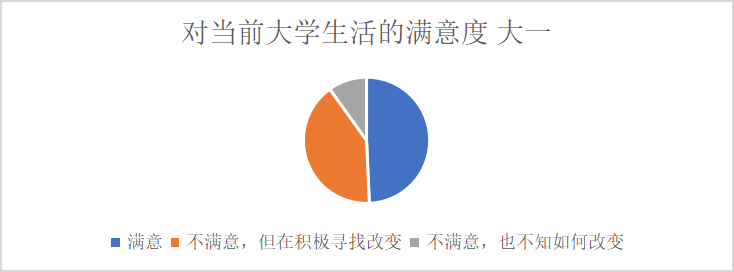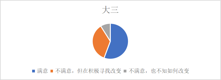 有850人对当前大学生活感到满意:其中大一249人,大二258人大三343人;646人对当前大学生活感到不满意,但在积极寻找改变:其中大一206人,大二222人,大三218人;158人感到不满意,也不知如何改变:其中大一50人,大二53人,大三55人。