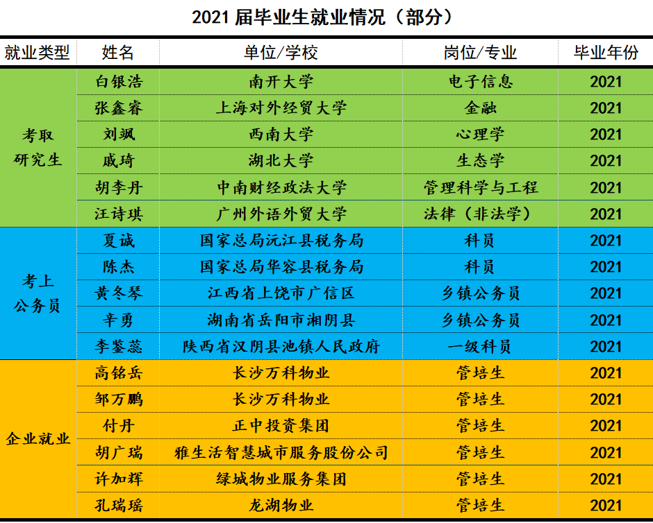 就业前景:本专业已与万科物业、融创物业等20余家知名企业建立了长期稳定的实习就业合作关系,毕业生就业前景广阔;本专业学生就业呈现就业率高、就业质量好、就业面广的特征。