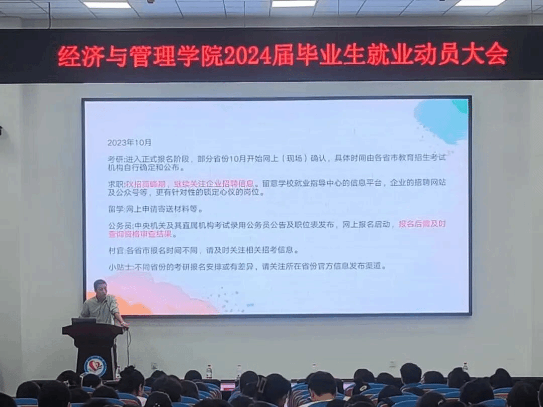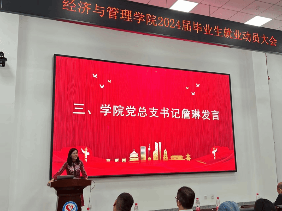 为深入贯彻党中央、国务院关于高校毕业生就业工作的决策部署,落实就业专项行动,稳步推进学院就业工作,促进毕业生高质量就业。10月24日下午,经济与管理学院2024届毕业生就业动员大会在经管大楼B405隆重召开。学院党总支书记詹琳、院长刘飞跃和各专业系主任出席本次动员大会,学院党总支副书记陈龙山主持会议。