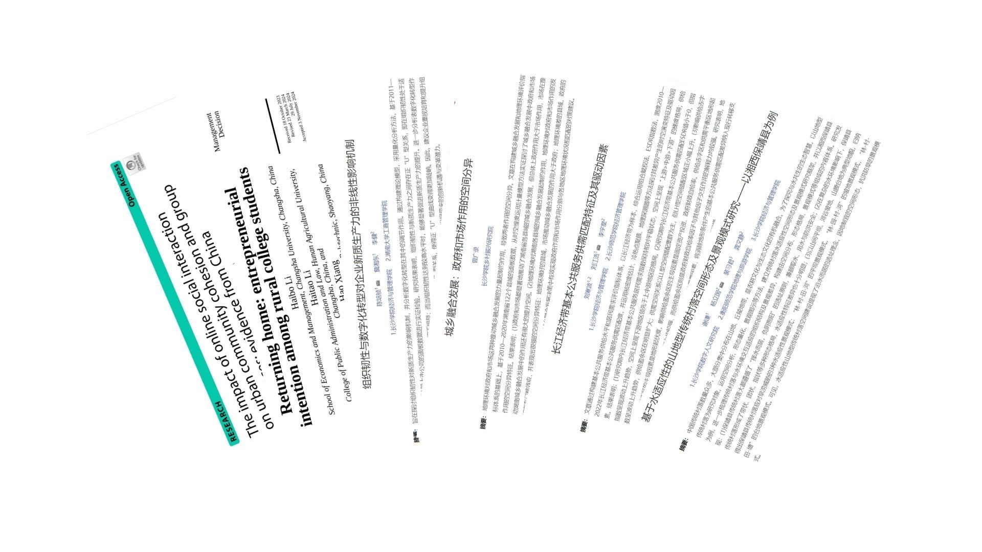1.在城乡发展与社会治理领域,李海波等在《Management Decision》发表SSCI论文《Returning home-Entrepreneurial intention among rural college students》,基于推拉理论与计划行为理论(TPB),运用结构方程模型探讨了返乡大学生创业意愿的形成机制。曾广录在《经济地理》发表《城乡融合发展:政府和市场作用的空间分异》(北大核心、CSCD、CSSCI收录),通过计量模型实证分析城乡融合中政府与市场作用的空间差异,并提出对策建议。刘寒波、刘江浩在《经济地理》发表《长江经济带基本公共服务供需匹配特征及其驱动因素》(北大核心、CSCD、CSSCI收录),综合运用组合赋权法与ESDR指数,揭示基本公共服务供需匹配特征及其驱动机制。李海波、刘飞跃等在《BMC Public Health》发表SCI论文《The impact of online social interaction on urban community cohesion and group differences evidence from China》,通过结构方程模型分析线上社交互动对城市社区凝聚力的影响及群体差异。